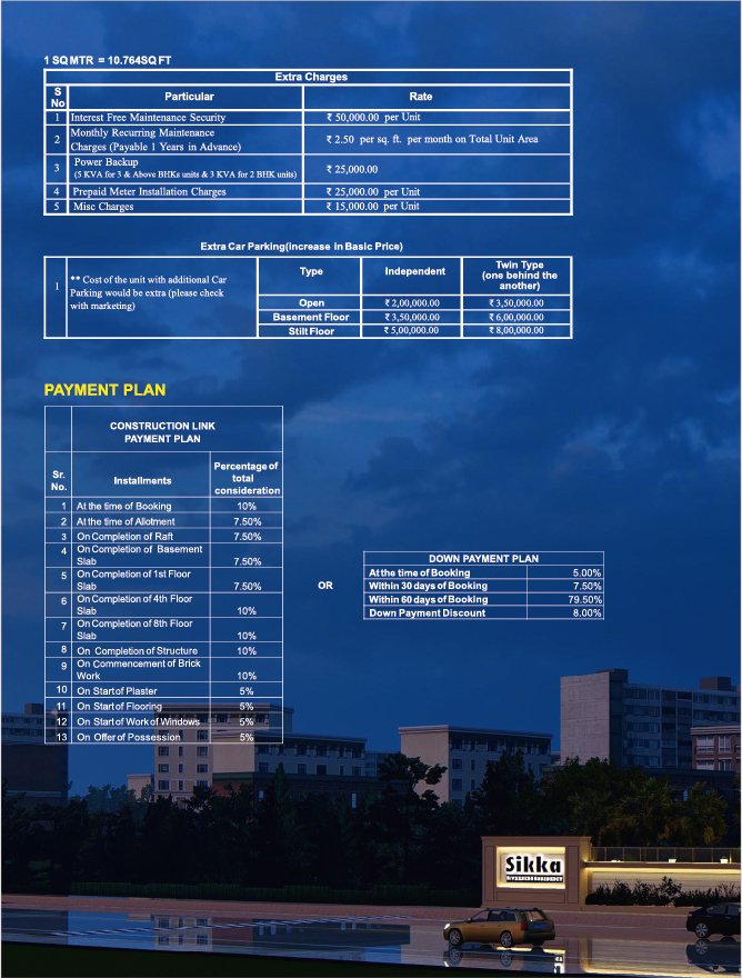 The project comprises apartments and is being developed in accordance with the sanctioned plans. The apartments may be sold as per the standard design, and Sikka Riverside Residency may make changes, alterations, or improvements as required. The furniture and accessories used in ATL/BTL marketing collaterals are for reference purposes only and are not part of the standard offering.